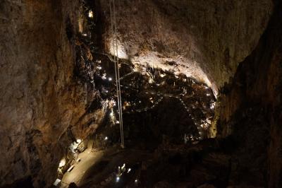 Gegenüber sieht man den Weg im Zickzack weiß beleuchtet, der uns mit 500 Stufen in die Höhle geführt hat. Diese ist angeblich die größte, für die Öffentlichkeit zugängliche Schauhöhle weltweit, was sich aber nur auf diesen Raum bezieht. Und der ist wirklich beeindruckend riesig!